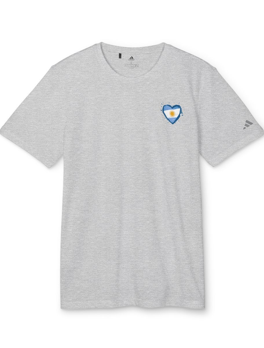 Celebrate Argentina with this eco-friendly adidas® tee featuring the iconic Sun of May and Argentinian flag heart design. Made from 100% recycled polyester, it offers moisture-wicking, UPF 50+ protection, and a regular fit for ultimate comfort. Ideal for workouts or casual wear, with the adidas® logo on the left sleeve adding a signature touch.